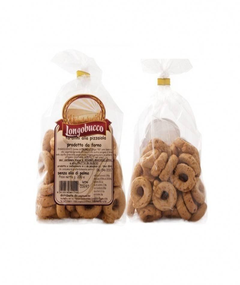 Taralli alla Pizzaiola, fatti a mano secondo antiche ricette, risultano semplici e gustosi al palato e sono ideali per spuntini e aperitivi. Assolutamente da provare. Gustoso e friabile è il giusto snack pomeridiano e l’aperitivo più amato.